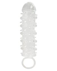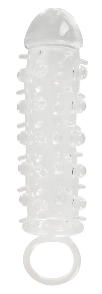 Penishülle mit 2-cm-Verlängerung und Hodenring! Einfach diese transparente, anschmiegsame Silikon-Penishülle überstreifen, den stramm sitzenden Hodenring umlegen und schon können Sie Ihre Partnerin mit einem 2 cm längeren Penis und unzähligen Reiznoppen lange verwöhnen... Auch passend für Dildo und Vibrator. Hülle in Länge 11 cm und Ø 3 xm (extrem dehnbar).